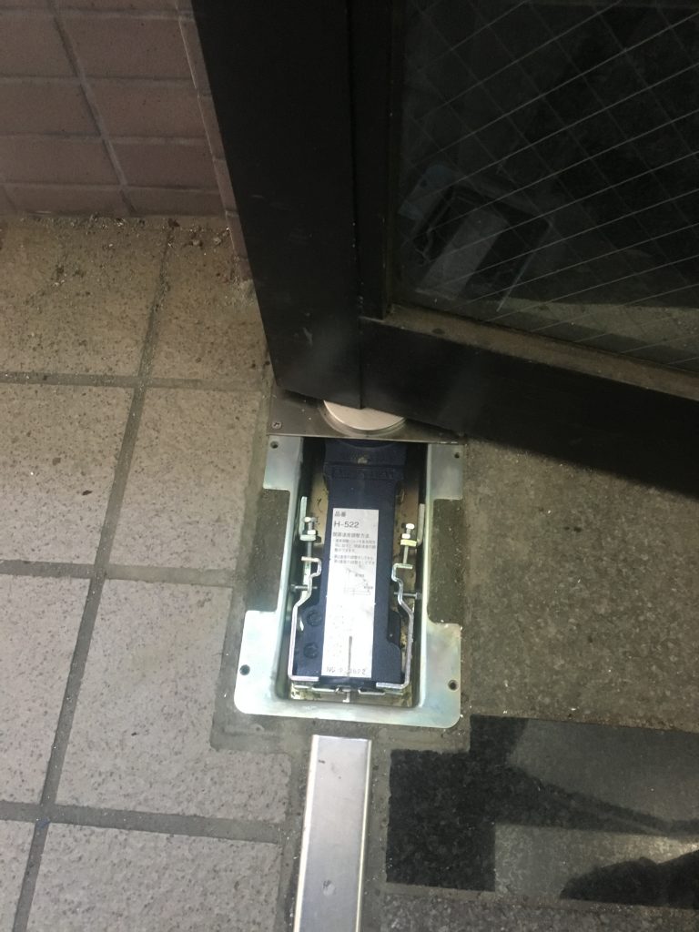 扉の開閉や速度調整の役割をしているフロアヒンジという部品が経年劣化をおこしているのが