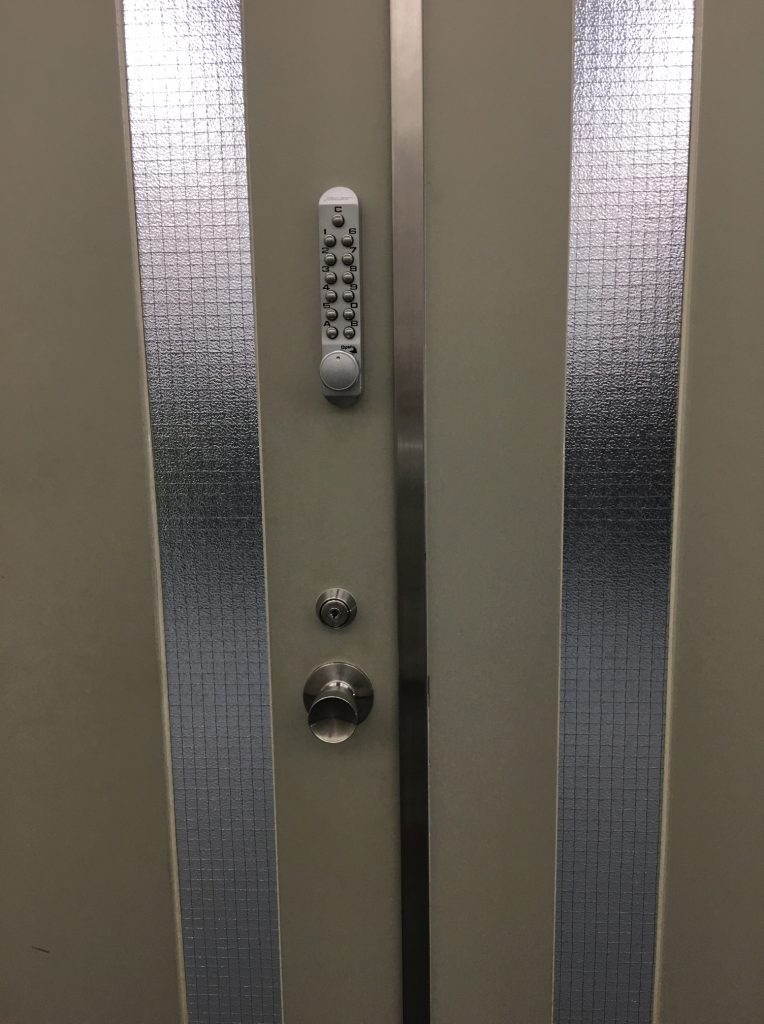 電気錠の上部に、自動施錠式のテンキーを設置しました。
