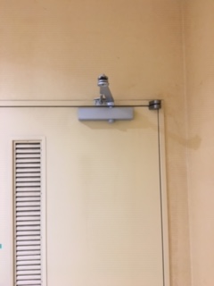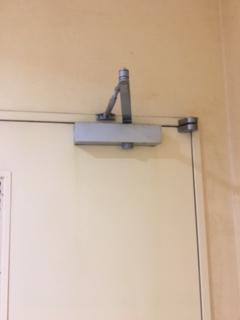 工場トイレのドアクローザーが油漏れを起こし修理不可の為交換を実施致しました。
