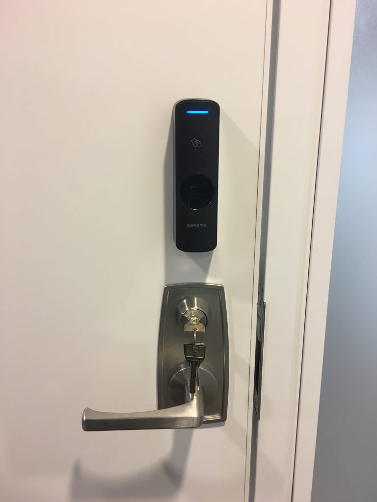 TOP ▸ 日々の実績 ▸ オフィス 入退管理システム spax指紋 2020.01.16 オフィス 入退管理システム spax指紋 出入口近くにある会議室にセキュリティを設置したいとの相談を受け、カード指紋認証機を御提案しました。 セキュリティが向上し、休憩時に離れても施錠状態になるようになりました。 パーテーション間仕切りに設置するには本体が大きい為、扉表面に取り付けました。 機能拡張ライセンスを使用することにより、センサーを付けなくても在室管理ができるようになりました。 日々の仕事実績一覧へ戻る
