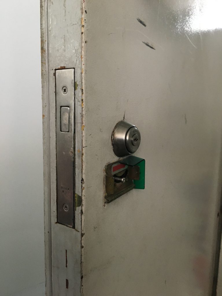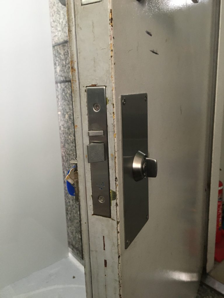 TOP ▸ 日々の実績 ▸ ビル 非常階段 錠前加工交換(MIWA AHT) 2020.02.10 ビル 非常階段 錠前加工交換(MIWA AHT) ビルの非常階段の扉が鍵のかけ忘れがおおいので 扉が閉まったら自動で施錠されるようにしたいというご依頼をいただきました。 非常用解錠装置がついていたのでステンレスの鉄板を貼って既存開口を隠しました。 また、マスターキー対応にもなっていて、かつ鍵の種類が廃番だったため 既存のものをそのまま流用できるように商品の選定にも気を使いました。 日々の仕事実績一覧へ戻る