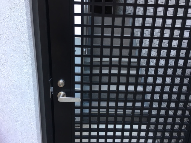 マンションのカギが付いた裏口門扉ですが、隙間から内側のレバーハンドルを下げて開けられてしまう状態でした。