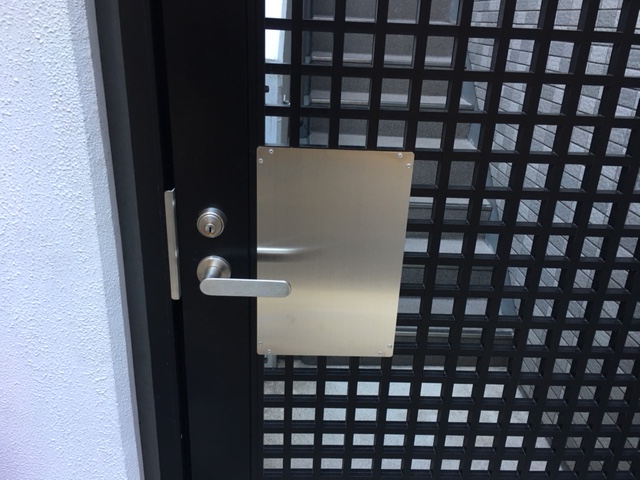 門扉を交換するとコストが掛かってしまう為、レバーハンドル付近にステンレスプレートを取り付けました。