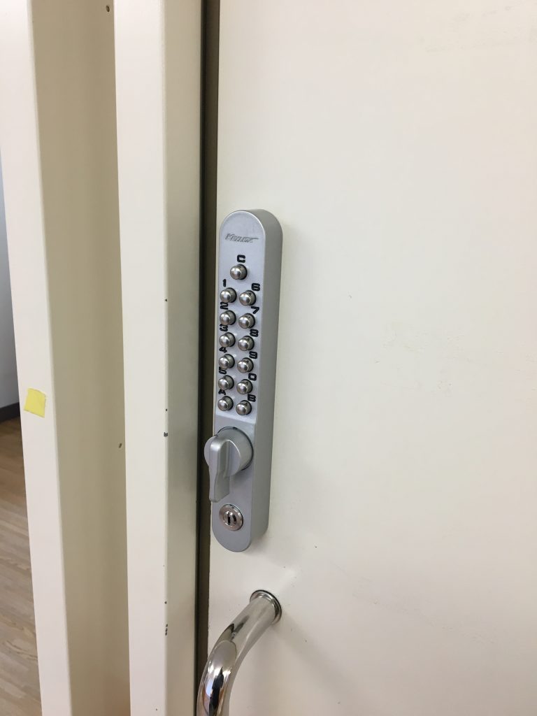 扉を閉めると自動で施錠し、入室の際は暗証番号操作、体質はサムターン操作です。