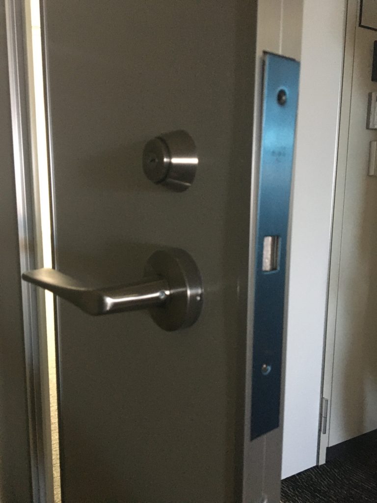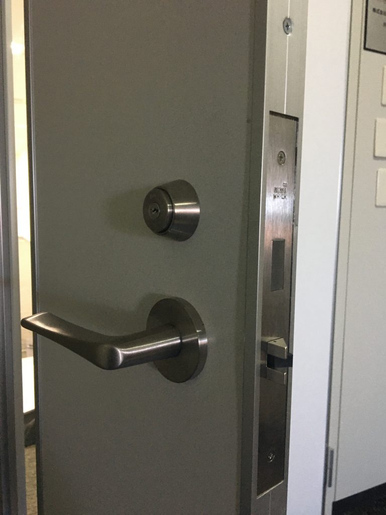 TOP ▸ 日々の実績 ▸ オフィス 入口 電気錠→一般錠交換(MIWA LHS) 2020.09.18 オフィス 入口 電気錠→一般錠交換(MIWA LHS) オフィスのテナント退去にともない、電気錠を一般錠にしてほしいという御依頼をいただきました。 美和のAUシリーズがついていましたのでほとんど加工なしでLHSシリーズに交換できました。 見た目もほぼ変わらず、鍵もそのまま流用できるので喜んでいただけました。 日々の仕事実績一覧へ戻る