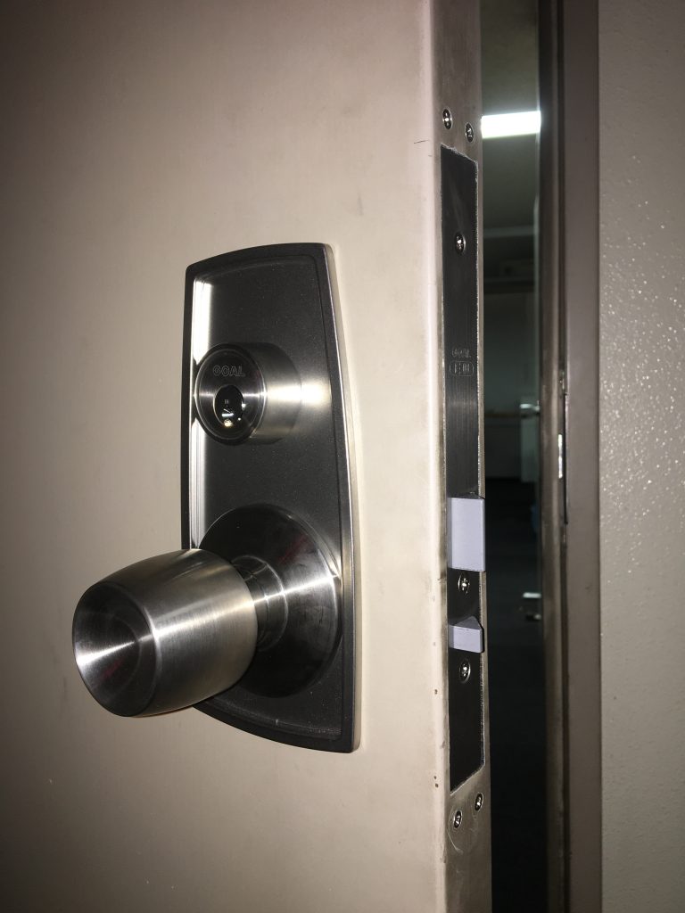 TOP ▸ 日々の実績 ▸ 事務所 入り口 電気錠設置(GOAL EU) 2020.11.27 事務所 入り口 電気錠設置(GOAL EU) 事務所入り口に電気錠を設置してきました。 既存がGOALというメーカーの鍵がついており、マスターキーと連動していましたので 同じくマスターキーで運用できるようにGOAL製の電気錠を選定・設置いたしました。 専用のエスカッションがなかったのでMIWA製のものを少し加工しておさめました。 日々の仕事実績一覧へ戻る