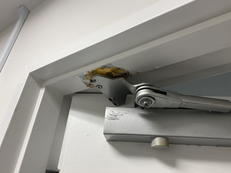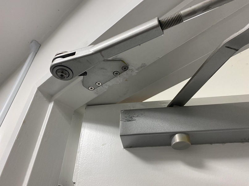 ビルのトイレ入り口ドアクローザーが不具合を起こしているので