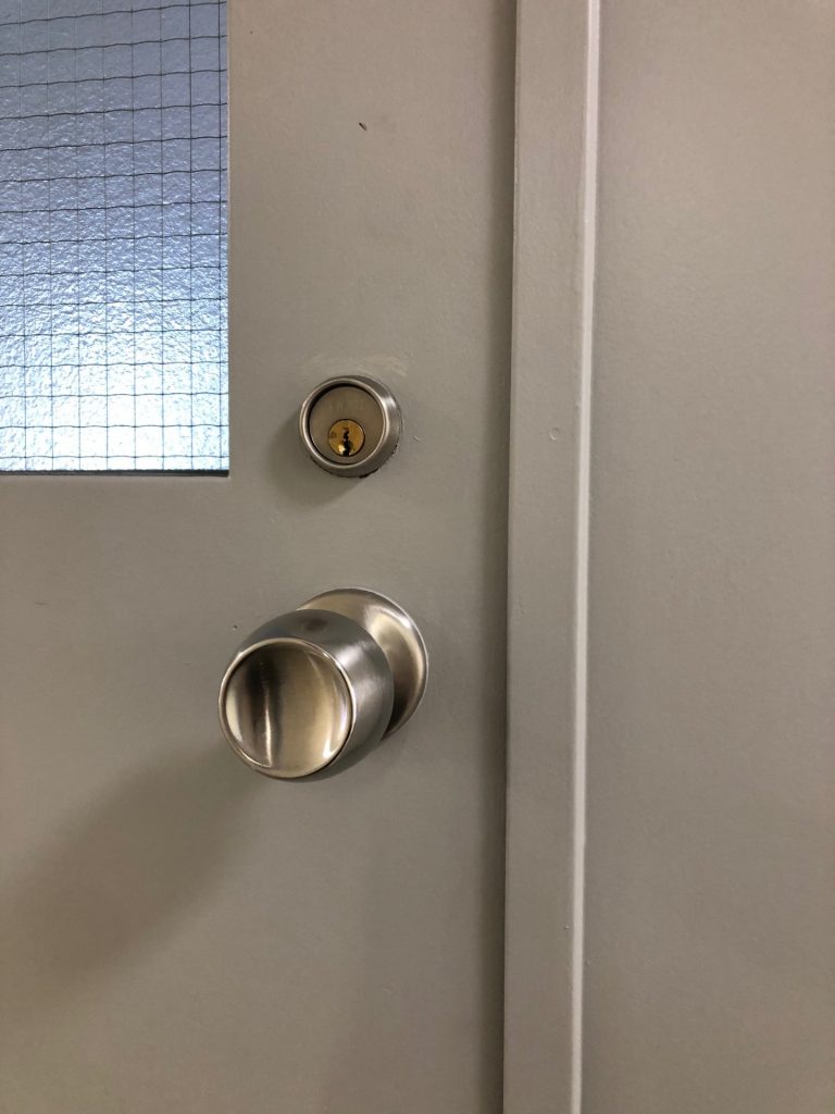 異なるタイプの錠前に加工交換する場合はエスカッションプレートを使用して既存の開口部を隠す事が多いのですが今回は一体型を使用しエスカッションプレートを使用せずに取付を行えました。
