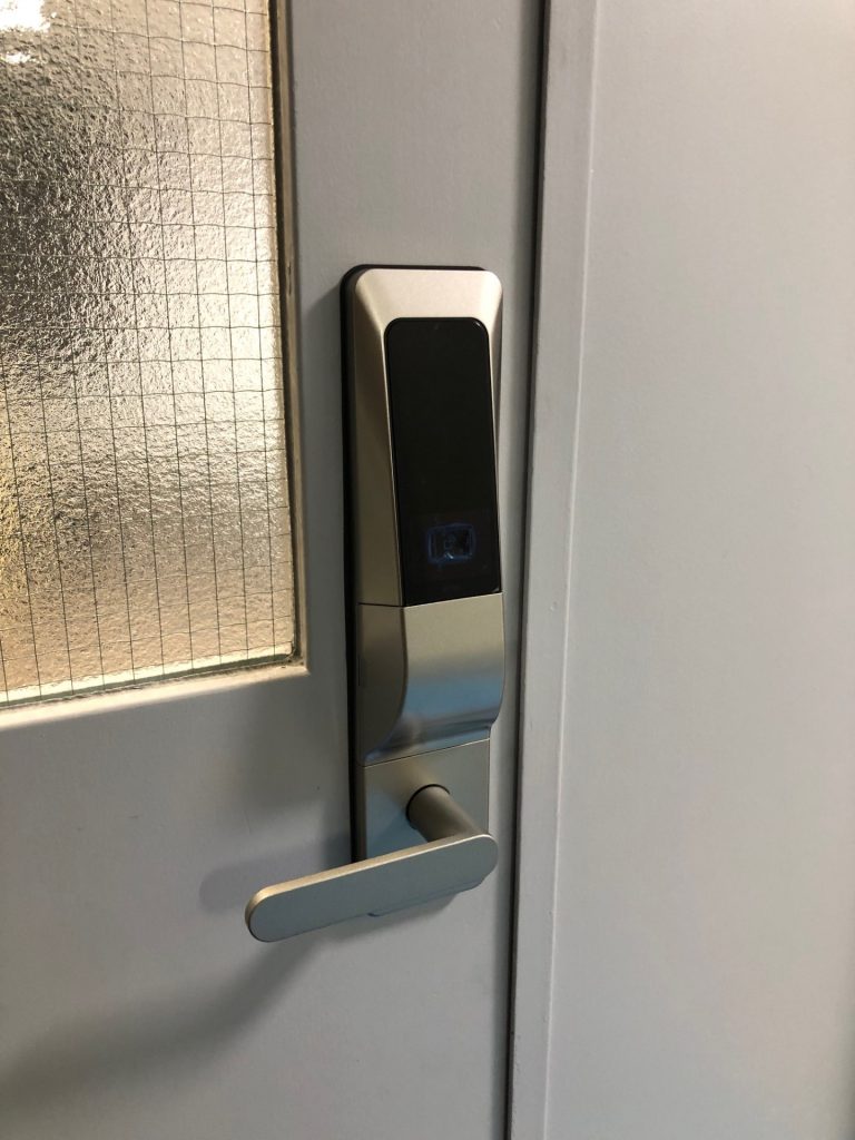 外側からはテンキーとカードを使用して解錠でき、内側からはレバーハンドルを下に降ろすだけで出ることができます。シリンダーもあるので電池切れの際にも物理キーで開けることも出来ます。