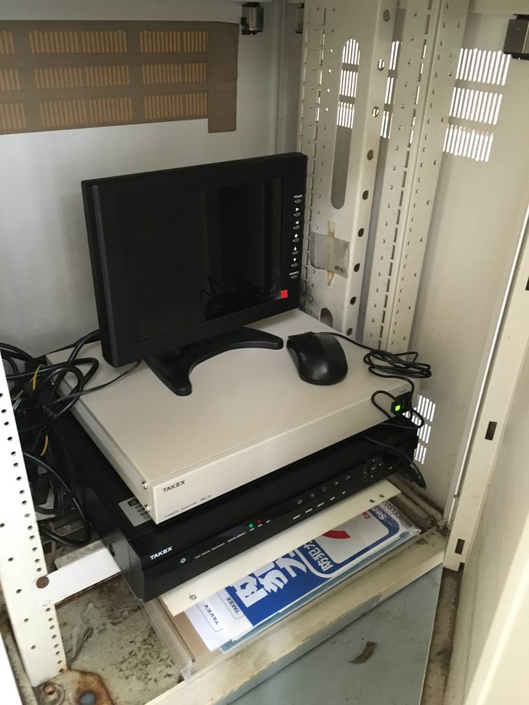 階段下のカメラ機器用の既存収納BOXを流用させていただき、録画機・電源装置・モニターを収納しております。